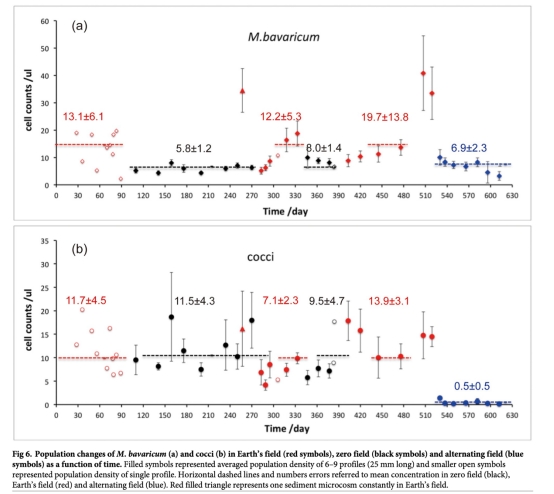 意義:直接量化趨磁優(yōu)勢。零場中M. bavaricum下降50%證明趨磁是其生存關鍵;球菌在交變場中幾乎滅絕,支持極性趨磁機制理論。