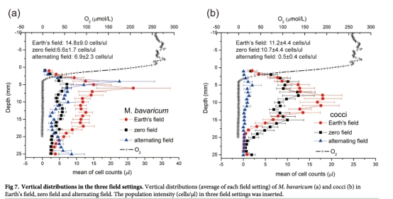 意義:揭示磁場對MTB生態(tài)位的影響。M. bavaricum在交變場中雙峰分布分異(圖7a),表明其可能通過"垂直穿梭"代謝適應異常磁場;球菌分布集中于OAI附近(圖7b),交變場導致其分布范圍收縮。