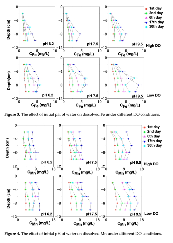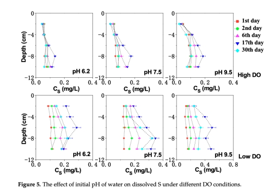 意義:低DO下溶解Fe/Mn峰值達(dá)5.65 mg/L和13.79 mg/L(pH 9.5),證明鐵錳還原溶解是砷釋放的主要途徑;溶解S濃度升高(0.41 mg/L)指示硫酸鹽還原參與砷遷移。