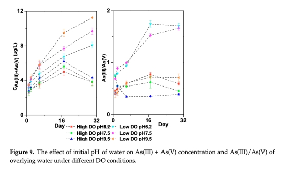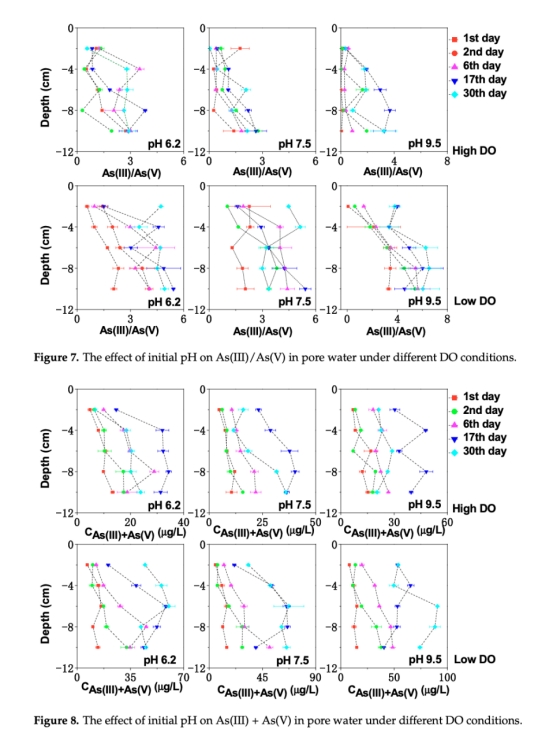 意義:低DO下沉積物Eh降至-125 mV(pH 9.5組),證實(shí)強(qiáng)還原環(huán)境促進(jìn)鐵錳氧化物還原溶解,驅(qū)動砷釋放。