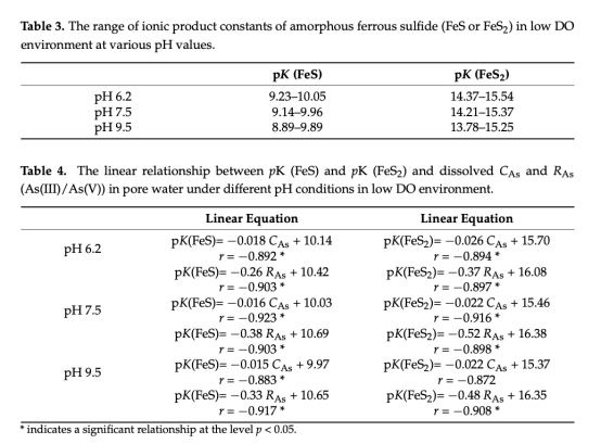 關(guān)鍵協(xié)同機(jī)制:低DO+pH 9.5條件下,離子交換(OH?競爭吸附)與厭氧還原(As(V)→As(III))協(xié)同作用導(dǎo)致最大釋放(孔隙水砷71.31 μg/L);無定形硫化亞鐵形成(pK(FeS)<10.05,表3)削弱砷吸附能力,進(jìn)一步促進(jìn)釋放。