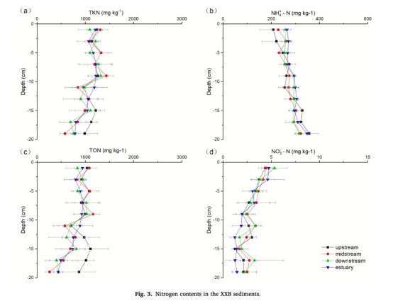 空間分布分析:沿香溪灣上、中、下游及河口采集沉積物巖芯,測定孔隙水和沉積物的氮形態(tài)(TKN、TON、NH??、NO??)分布(圖2、圖3)。