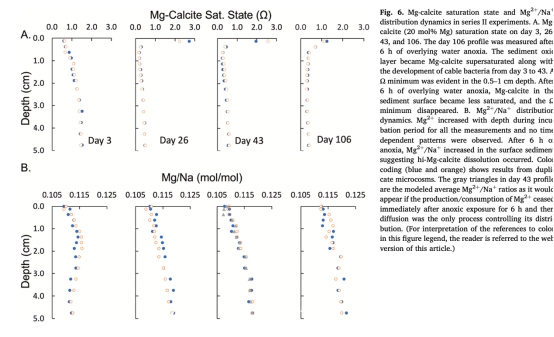 探討了電纜細菌在缺乏鐵(Fe)和錳(Mn)的碳酸鹽沉積物(美國佛羅里達灣)中的活動及其對元素循環的影響。通過實驗室微宇宙實驗,結合高分辨率傳感技術(如平面光學傳感器和微電極),研究發現電纜細菌可利用深層溶解態硫化物(H?S)作為還原劑,無需依賴固態硫化物或鐵錳循環即可維持電硫氧化(e-SOx)代謝。電硫氧化導致沉積物表層(陰極區)pH升高(~8.5)促進文石和高鎂方解石沉淀(Ω=2-3),而亞表層(陽極區)pH降低(~6.5)引發碳酸鹽溶解(Ω=0.2-0.3),伴隨Ca2?、Mg2?釋放。磷酸鹽(ΣPO?3?)在電活性區被消耗,可能與電纜細菌細胞內聚磷酸鹽積累有關,這對磷受限的碳酸鹽沉積物中海草磷獲取有潛在意義。