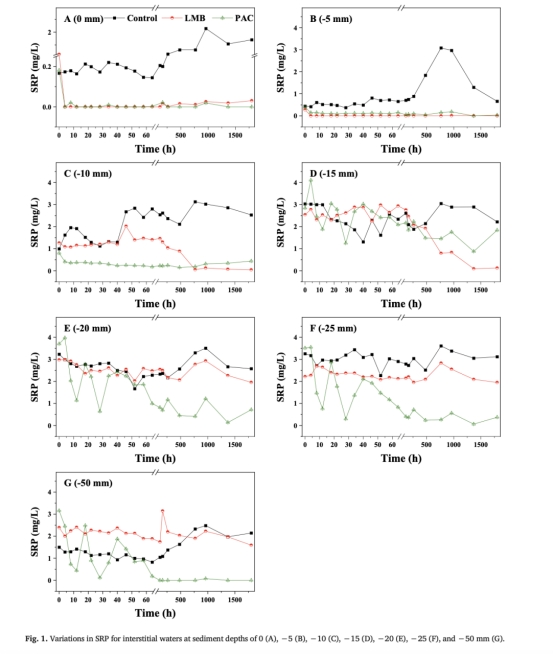 SRP(圖1):監(jiān)測孔隙水中磷濃度變化,評估鈍化劑對磷的即時與長期去除效果。意義:揭示PAC對深層SRP(-50 mm)的高效控制(100%去除率),但中層(-15 mm)因pH降低導致去除率最低(35%)。