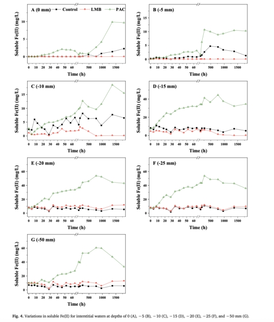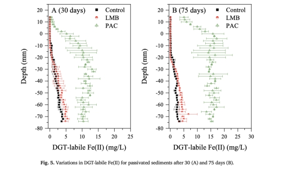 可溶性Fe(II)(圖4)與DGT活性Fe(圖5):同步監(jiān)測溶解態(tài)和活性鐵。意義:揭示PAC引發(fā)全剖面Fe(II)劇增(pH降低促進解吸),直接驅(qū)動磷釋放(圖2中層通量升高)。