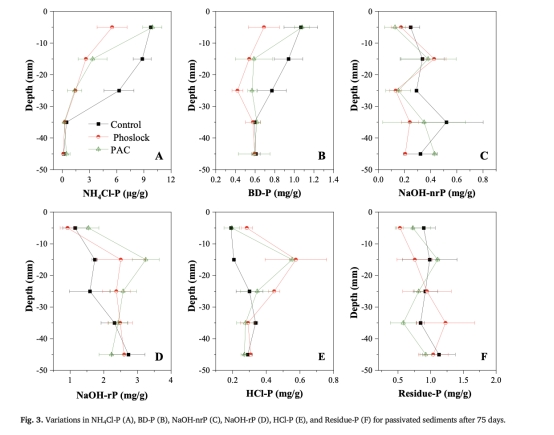 磷形態(tài)(圖3):分析不同結(jié)合態(tài)磷的轉(zhuǎn)化。意義:LMB將活性磷(NH?Cl-P、BD-P)轉(zhuǎn)化為穩(wěn)定HCl-P(LaPO?),而PAC增加NaOH-rP(鋁結(jié)合磷)和HCl-P(鐵結(jié)合磷)。