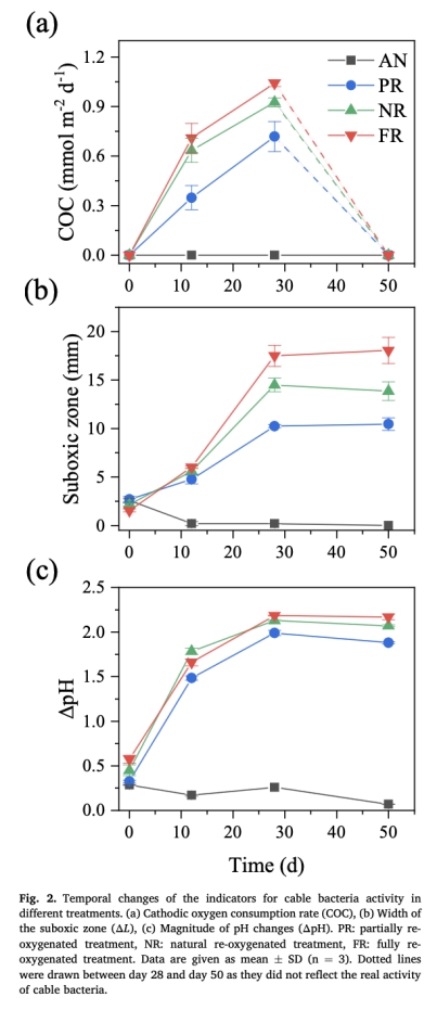 COC率在28天達(dá)峰值(FR組1.04 mmol m?2 d?1)(圖2a),與電纜細(xì)菌密度增長同步(圖4a),直接關(guān)聯(lián)氧氣可用性與代謝強(qiáng)度。后期COC率下降反映堿性物質(zhì)向上覆水?dāng)U散,凸顯代謝產(chǎn)物的遷移效應(yīng)。