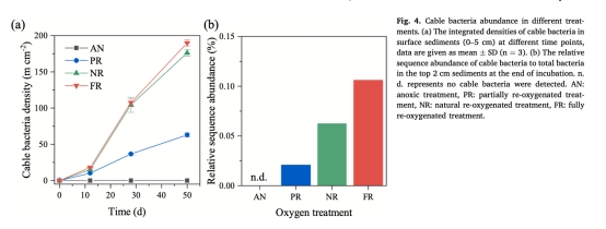 意義:量化氧氣對種群規(guī)模的調(diào)控作用。FR組50天時(shí)電纜細(xì)菌密度(190 m cm?2)是PR組的2.9倍,證實(shí)氧氣是種群增長的關(guān)鍵限制因子。