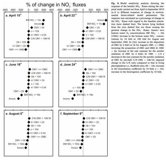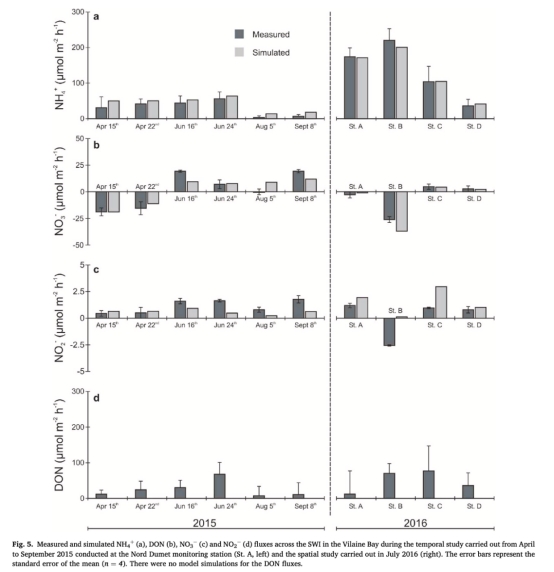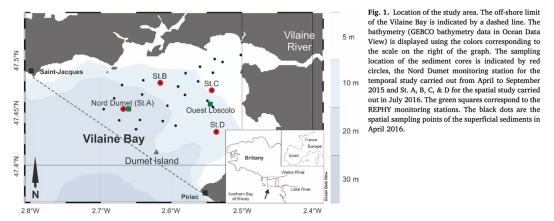研究通過現(xiàn)場觀測、實驗室測量和反應輸運模型(RTM),探究了法國富營養(yǎng)化溫帶大型潮汐海灣——Vilaine灣(VB)底棲氮(N)循環(huán)的時空變化。基于2015年單站時間序列(6次)和2016年多站空間調查的數(shù)據(jù)分析表明: