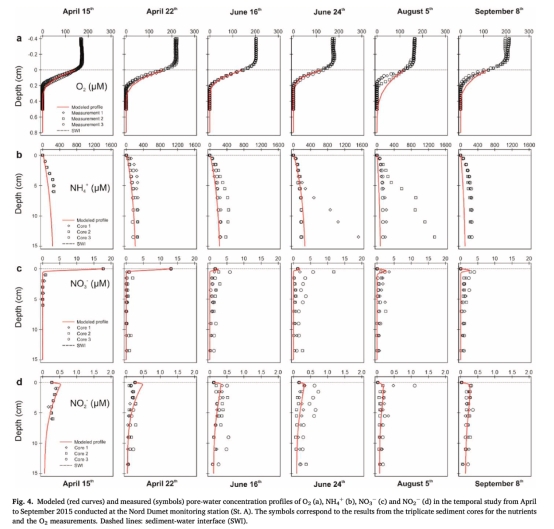 O?在沉積物表層2 mm內耗竭(圖4a),指示好氧礦化集中在SWI。