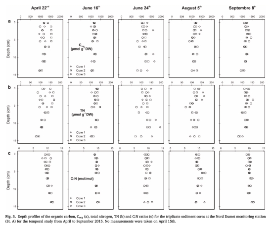 時間序列(2015年4-9月):Nord Dumet(ND)站每月采集沉積物柱樣(圖1),測定孔隙水DIN/DON剖面(圖4)、底棲通量(圖5)及硝化/反硝化速率。