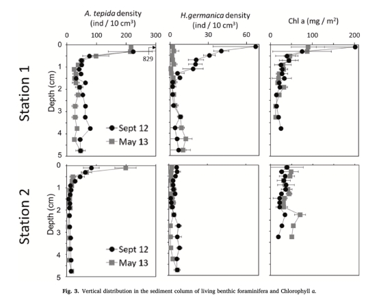 意義:揭示Ammonia tepida在表層(0–1 cm)富集(最高829 ind/10 cm3),隨深度呈指數(shù)下降,反映化學趨向性驅(qū)動的微生境選擇。