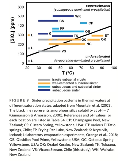 保存窗口:硅濃度>200 ppm可形成持久泉華(如Octopus Spring),<150 ppm僅存脆性硅殼(圖9)。