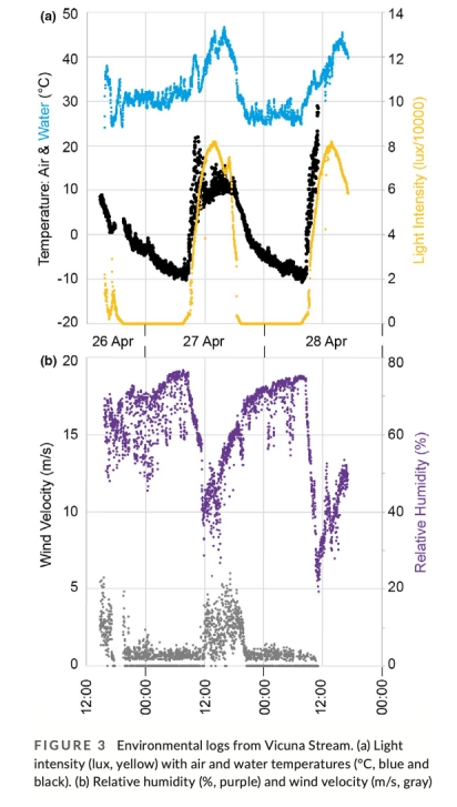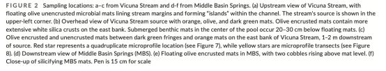 智利El Tatio熱泉區(qū)兩條溪流(Vicuna Stream和Middle Basin Springs)的漂浮微生物席(圖1-2)。