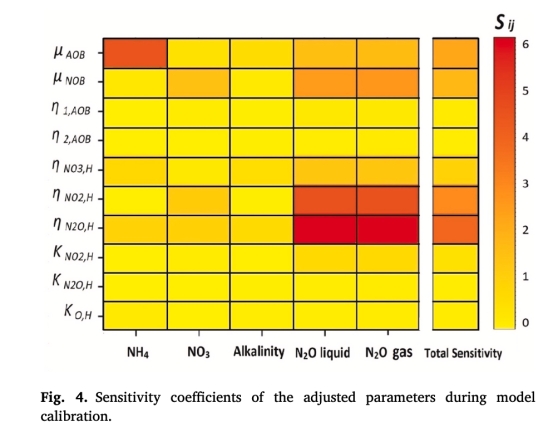 初步校準(10參數)→ 靈敏度分析(圖4)→ 相關性矩陣(表2)→ 最終校準(4個關鍵參數:ηN2O,H、ηNO2,H、μAOB、μNOB)