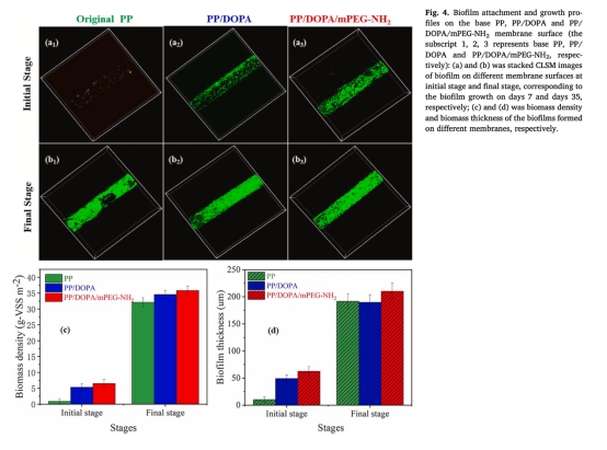 改性膜(尤其PP/DOPA/mPEG-NH?)通過降低微生物附著能壘(XDLVO理論)加速生物膜形成,縮短MBfR啟動時間31%。