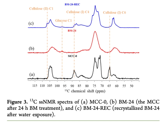2. 水誘導(dǎo)重結(jié)晶驗(yàn)證:將球磨后MCC暴露于水(40°C,30 min),通過XRD(圖2a)和固態(tài)NMR(圖3)檢測(cè)纖維素II型形成。