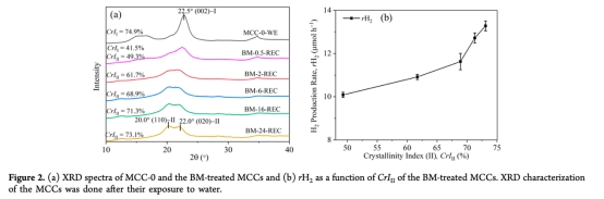 2. 纖維素II型比例(CrIII)與H?產(chǎn)率(rH?)正相關(guān),歸因于其疏松晶格結(jié)構(gòu)提升水解效率。