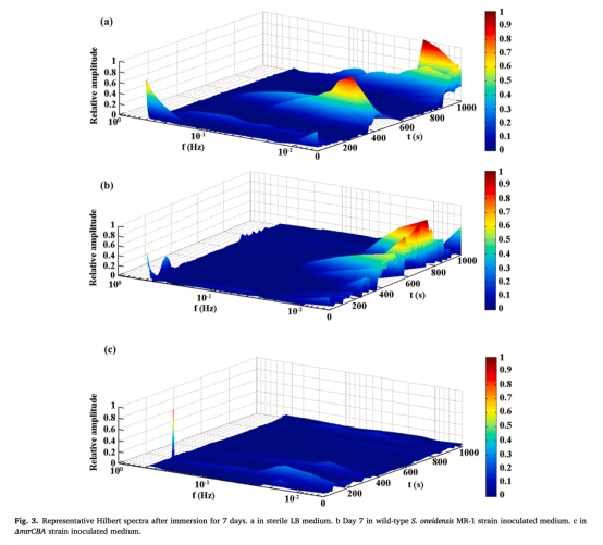 本研究揭示好氧條件下Shewanella oneidensis MR-1通過生物膜直接攝取電子導致不銹鋼腐蝕的新機制。通過構建孔蛋白-細胞色素復合體(MtrCBA)基因缺失菌株(ΔmtrCBA),結合電化學噪聲、希爾伯特譜分析及丹麥Unisense微電極測量,證實: