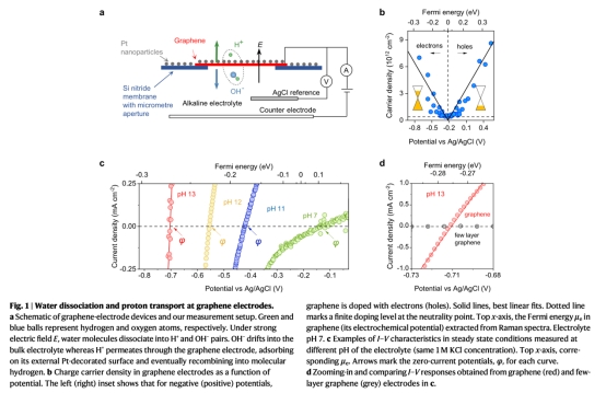 1. 強電場(>10? V/m)在石墨烯-水界面顯著加速水解離,質子電流隨電場指數增長,定量符合昂薩格理論(ε?≈6)