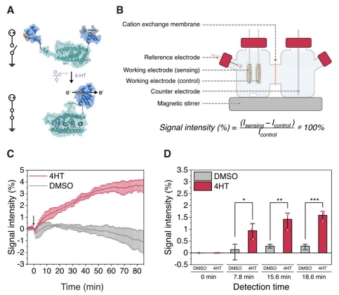 將雌激素受體配體結合域整合至鐵氧還蛋白(Fd),構建4-HT門控電子開關(圖3A)