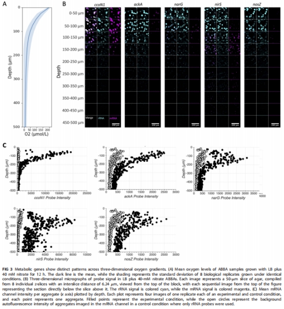 中層缺氧區(50-150μm)narG峰值與氧電極測量的臨界氧閾(5%-10%) 一致;