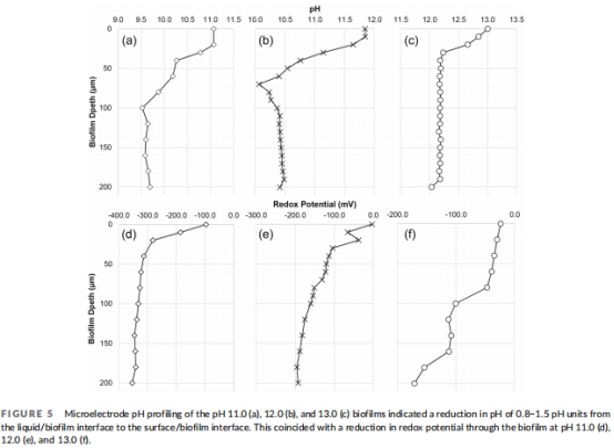 微電極pH/氧化還原剖面 圖5a–f 核心意義:量化生物膜內(nèi)部微環(huán)境梯度,證實EPS的物理屏蔽效應(見下文詳解)。