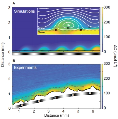 氧氣分布悖論:DBL中高氧區位于低葉綠素的口部上方,低氧區位于高葉綠素的共肉上方(圖2C-D)