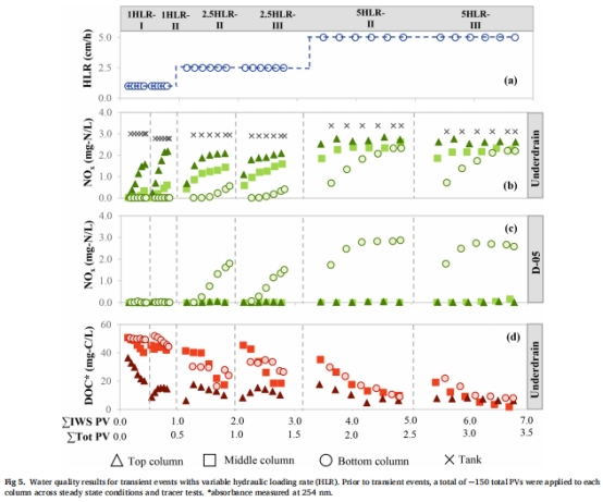 瞬態(tài)流表現(xiàn):底部排水口在HLR=1-5 cm/h范圍均保持最低出水氮濃度(圖5b)