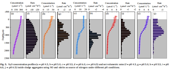有FNA時N?O生成速率 圖5f–j FNA存在進一步刺激生成速率(pH4.5時比無FNA高8.4%),增加底物效應。