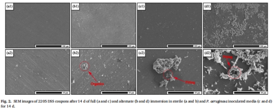 論文探究了銅綠假單胞菌(Pseudomonas aeruginosa)在完全浸沒(full immersion)與交替浸沒(alternate immersion)條件下對2205雙相不銹鋼(DSS)點蝕行為的差異影響。關鍵發現包括: