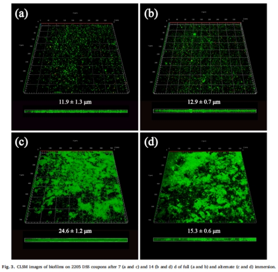 生物膜厚度/活菌密度 圖3(CLSM),圖4 交替浸沒生物膜更厚(24.6 μm)、活菌更多(6.0×10? cells/cm2),加速局部腐蝕。
