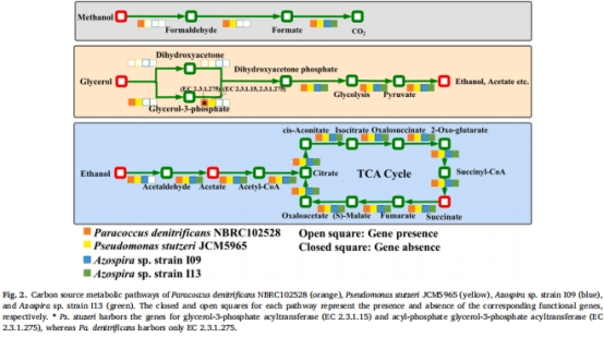 基因組分析:比對4株菌(2株clade I:P. denitrificans、Ps. stutzeri;2株clade II:Azospira sp. I09/I13)的碳代謝基因(圖2)。