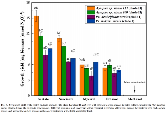 生物量產(chǎn)率 圖3 乙酸鹽下clade II菌株產(chǎn)率最高(15.45 mg/mmol-N?O),表明能量轉(zhuǎn)化效率優(yōu)勢。