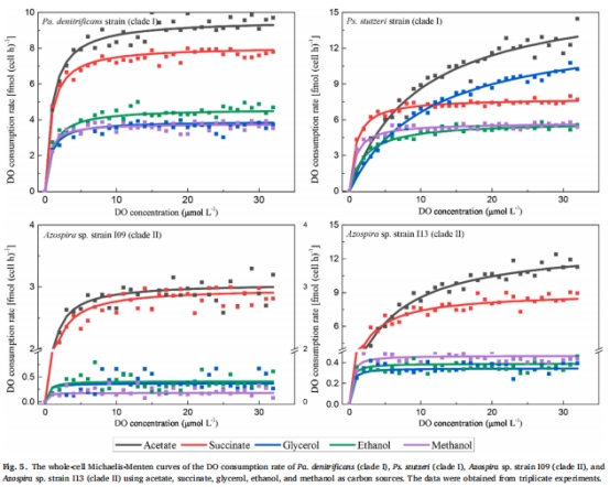 乙酸鹽添加后,Azospira sp. I13的DO消耗速率(V<sub>max,DO</sub>=13.35 fmol/(cell·h))與N?O消耗速率(V<sub>max,N?O</sub>=18.84 fmol/(cell·h))同步提升,揭示碳源直接驅(qū)動電子傳遞鏈效率。