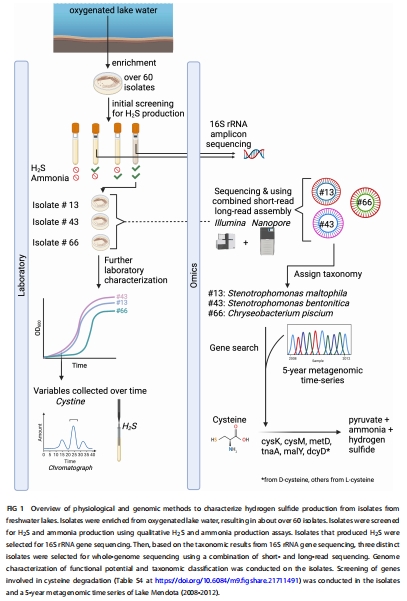 摘要指出:在富氧淡水環(huán)境中,細(xì)菌可通過降解含硫氨基酸(如半胱氨酸)產(chǎn)生硫化氫(H?S)。傳統(tǒng)觀點認(rèn)為H?S主要源自厭氧環(huán)境(如沉積物),但本研究通過分離菌株、生理實驗和基因組分析,證實了多種好氧淡水細(xì)菌(變形菌門、擬桿菌門、放線菌門)可在有氧條件下降解半胱氨酸并釋放H?S。結(jié)合5年宏基因組時間序列數(shù)據(jù)(威斯康星州門多塔湖),進(jìn)一步證明此類菌株及半胱氨酸降解基因在自然水體中廣泛存在,提示有氧H?S生產(chǎn)是淡水硫循環(huán)中被忽視的過程。