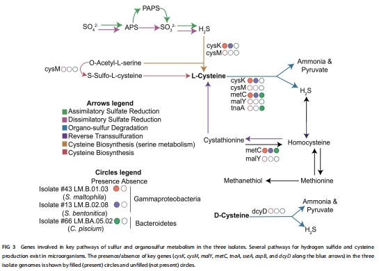 29株淡水好氧細(xì)菌可通過半胱氨酸降解產(chǎn)H?S,三株代表菌株(S. maltophilia, S. bentonitica, C. piscium)的基因組均攜帶降解基因。
