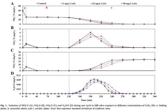 反應(yīng)器性能:在SBR中測試不同濃度CeO? NPs(0、1、25、50 mg/L)對氮轉(zhuǎn)化及N?O排放的動(dòng)態(tài)影響(圖1)。