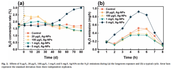 劑量依賴性:Ag-NPs≤1 mg/L輕微抑制N?O排放,5 mg/L顯著促進(+67.54%)。