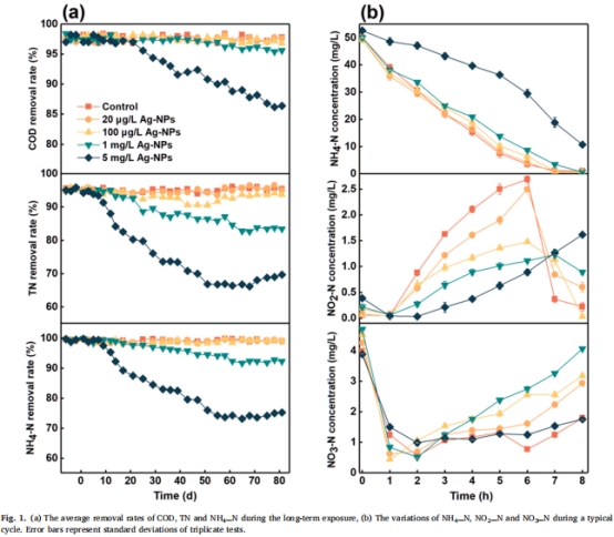數據來源:5 mg/L Ag-NPs使TN去除率從95.4%降至69.7%,NH??-N去除率顯著降低(P<0.05)。