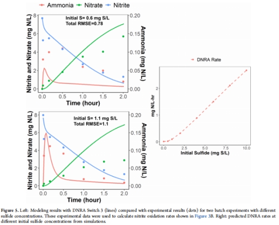 DNRA速率預測:模型顯示DNRA速率在硫化物存在時可超硝化速率(圖5右)。