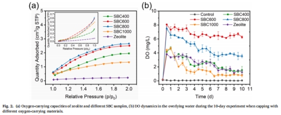 增氧性能:載氧生物炭(O-SBC)使水體DO從0.14 mg/L快速升至7.87 mg/L,并穩定維持在4.78 mg/L(圖2b)。