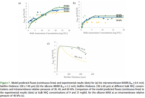 模型指導設(shè)計:MABR模型可準確預測通量(圖7),支持膜類型與操作參數(shù)優(yōu)化。