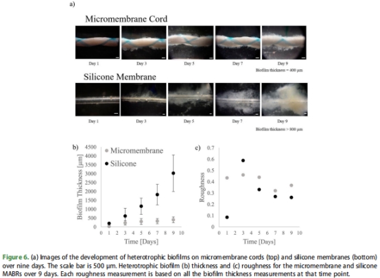 硅膠膜生物膜更厚(3 mm vs. 400 μm)、更均勻(粗糙度系數(shù)0.39 vs. 0.33)。