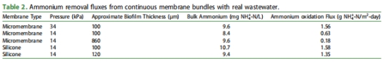 硝化性能:在合成廢水中,硅膠膜的最大銨氧化通量(7.8 gN/m2d)顯著高于微膜束(4.3 gN/m2d),但氨氮濃度<5 mgN/L時兩者通量相近(圖7)。