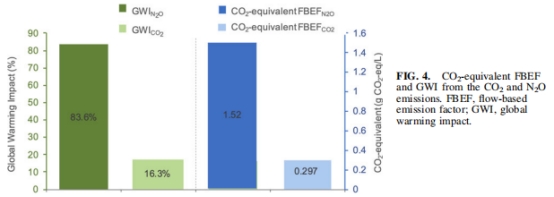 碳足跡:盡管CO?排放量更高(FBEF<sub>CO?</sub>=0.297 g/L),但N?O的全球變暖潛勢(GWP)是CO?的265倍,導致其全球變暖貢獻(GWI)占比83.6%,遠超CO?的16.4%(圖4)。