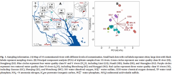 樣本采集:在珠江三角洲10條水質(zhì)等級(jí)不同的河流采集沉積物(圖1A),按水質(zhì)指數(shù)(WQI)分為III、IV_V、r_VI(修復(fù)后VI類)、VI四組。