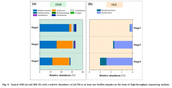 高壓CO?(0.016 MPa) → 生物膜酸化(pH 6.5)→ 嗜酸SRB競爭占優(yōu) → DNB豐度下降(Methyloversatilis從41.11%降至17.71%)(圖4)。