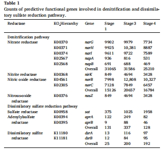 | 功能基因豐度 | PICRUSt預(yù)測(KEGG) | 表1 | 解釋代謝途徑變化:硝酸鹽還原酶基因(*narGHI*)減少,硫酸鹽還原酶基因(*sat*)增加(3.3.3節(jié))。