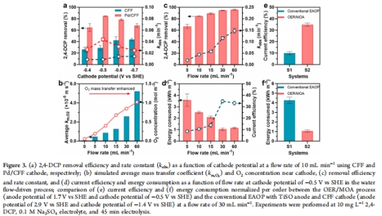 創新機制:利用水流將陽極產生的O?輸送至Pd陰極,通過原子氫(H*)活化生成羥基自由基(?OH),實現低電位(1.7 V vs SHE)運行(傳統EAOP需>2.3 V)。